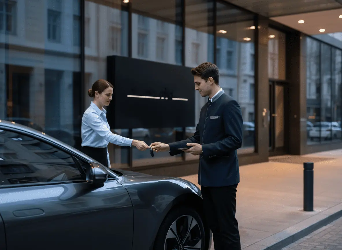 El valet recibe el auto, toma fotos del estado y envía un ticket digital al cliente vía SMS o WhatsApp.